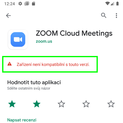 Pokud uvidíš tuto chybovou hlášku (zeleně zvýrazněno), nemůžeš nainstalovat potřebnou aplikaci a musíš tedy použít jiné zařízení.