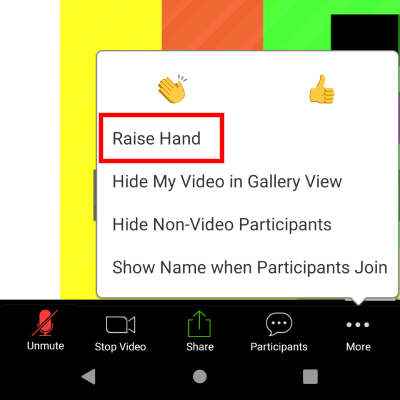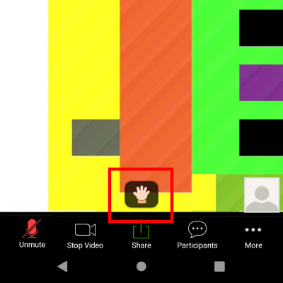 Klikni na text "Raise Hand" (červeně zvýrazněno). Tím dáš najevo, že zvedneš ruku a ostatní to uvidí.