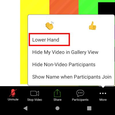 Klikni na tlačítko "Lower Hand" (červeně zvýrazněno). Tím dáš najevo, že se už hlásit nechceš.