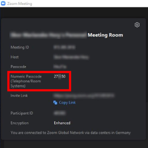 Heslo, se kterým se někdo může připojit k přenosu je na řádku s popiskem: Numeric Passcode (Telephone/Room Systems) - (červeně zvýrazněno).